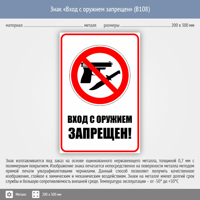 Знак «Вход с оружием запрещен», B108 (металл, 200х300 мм) в Ачинске купить