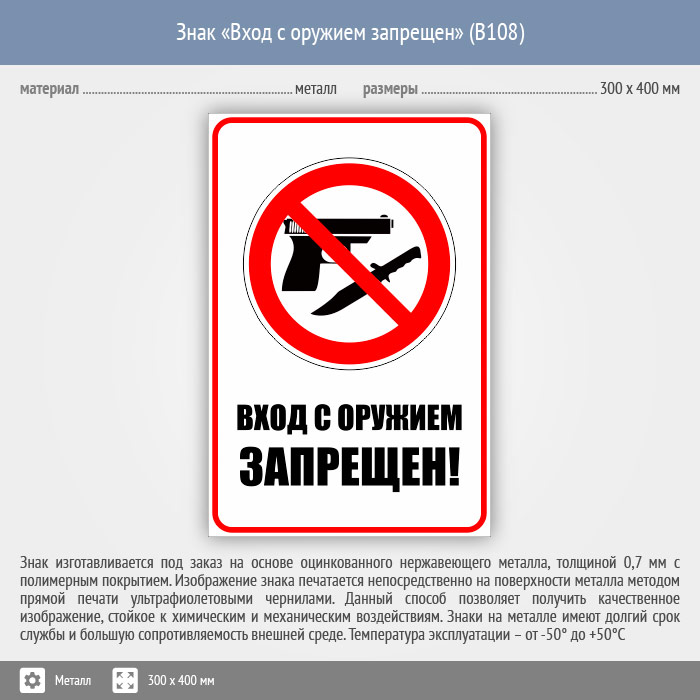 Знак «Вход с оружием запрещен», B108 (металл, 300х400 мм) в Ачинске купить