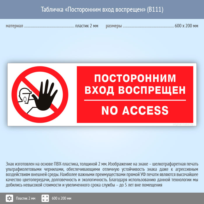 Табличка «Посторонним вход воспрещен», B111 (пластик, 600х200 мм) в Ачинске купить