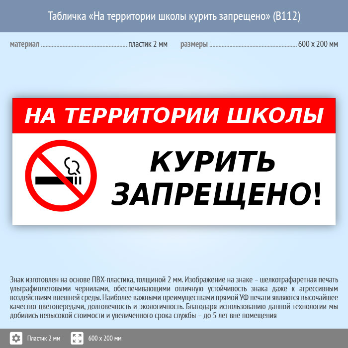 Табличка «На территории школы курить запрещено», B112 (пластик, 600х200 мм) в Ачинске купить