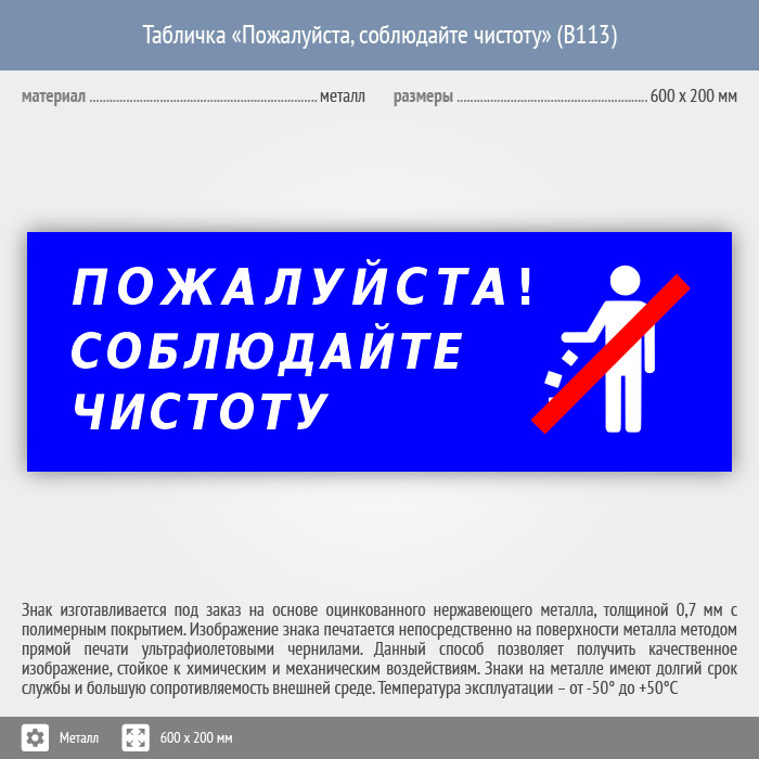 Табличка «Пожалуйста, соблюдайте чистоту», B113 (металл, 600х200 мм) в Ачинске купить