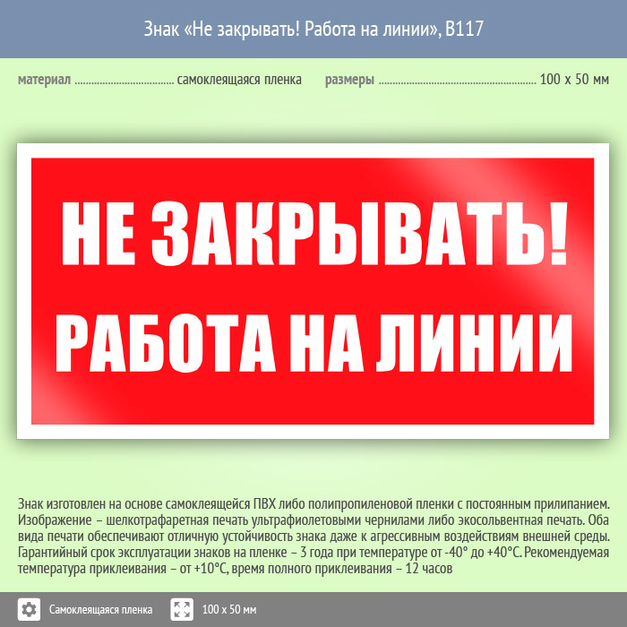 Знак «Не закрывать! Работа на линии», B117 (пленка, 100х50 мм) в Ачинске купить