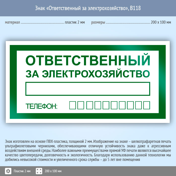 Знак «Ответственный за электрохозяйство», B118 (пластик, 200х100 мм) в Ачинске купить