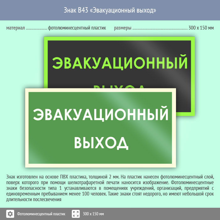 Знак B43 «Эвакуационный выход» (фотолюминесцентный пластик, 300х150 мм) в Ачинске купить