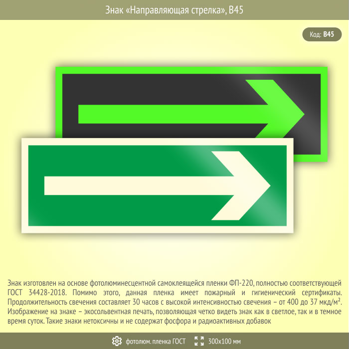 Знак «Направляющая стрелка», B45 (фотолюминесцентная пленка ГОСТ 34428-2018, 300х100 мм) в Ачинске купить