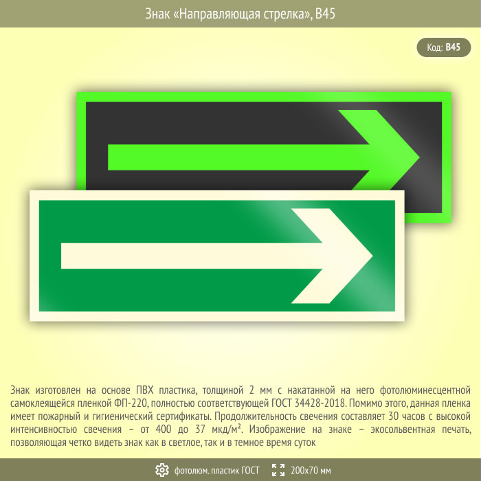 Знак «Направляющая стрелка», B45 (фотолюминесцентный пластик ГОСТ 34428-2018, 200х70 мм) в Ачинске купить