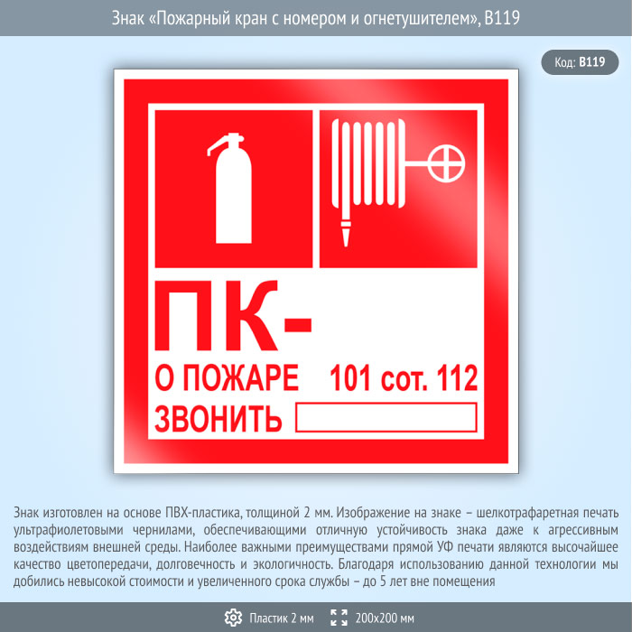 Знак «Пожарный кран с номером и огнетушителем», B119 (пластик, 200х200 мм) в Ачинске купить