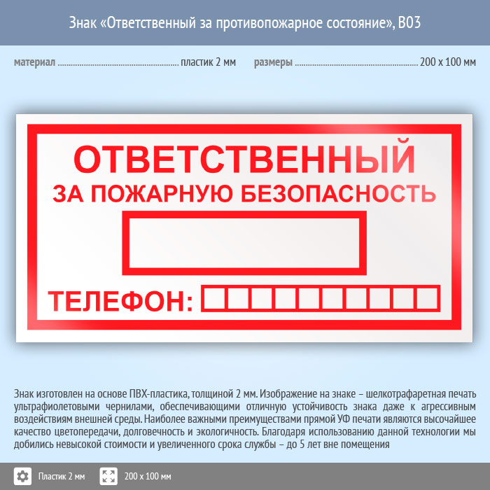 Знак «Ответственный за пожарную безопасность», B03 (пластик, 200х100 мм) в Ачинске купить