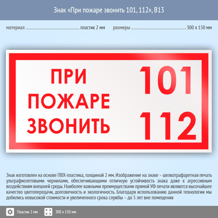 Знак «При пожаре звонить 101, 112», B13 (пластик, 300х150 мм) в Ачинске купить