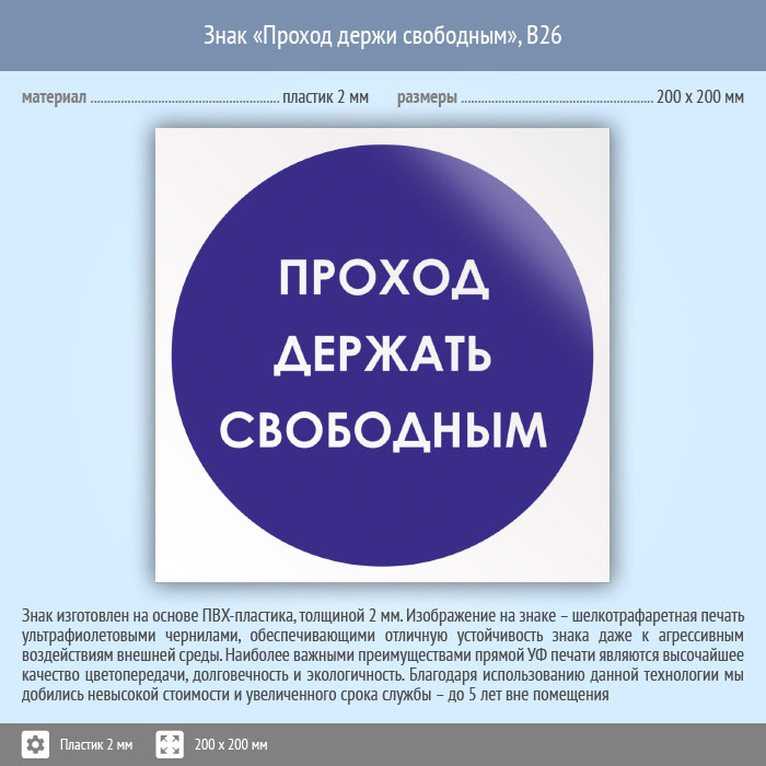 Знак «Проход держи свободным», B26 (пластик, 200х200 мм) в Ачинске купить