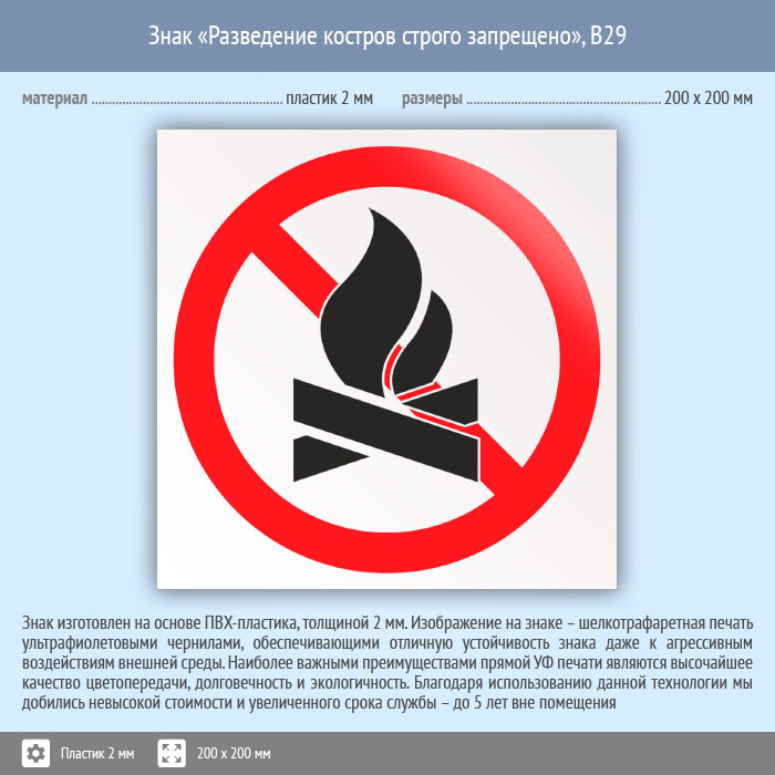 Знак «Разведение костров строго запрещено», B29 (пластик, 200х200 мм) в Ачинске купить