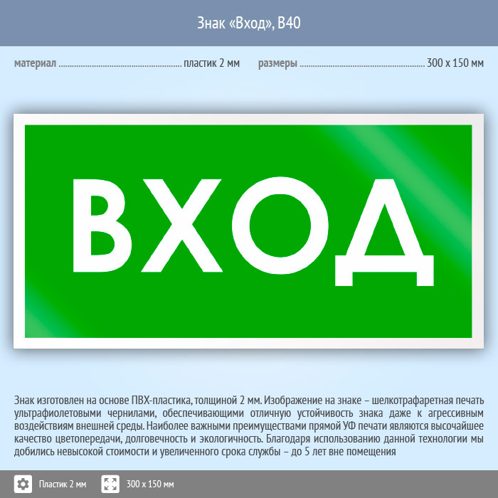 Знак «Вход», B40 (пластик, 300х150 мм) в Ачинске купить