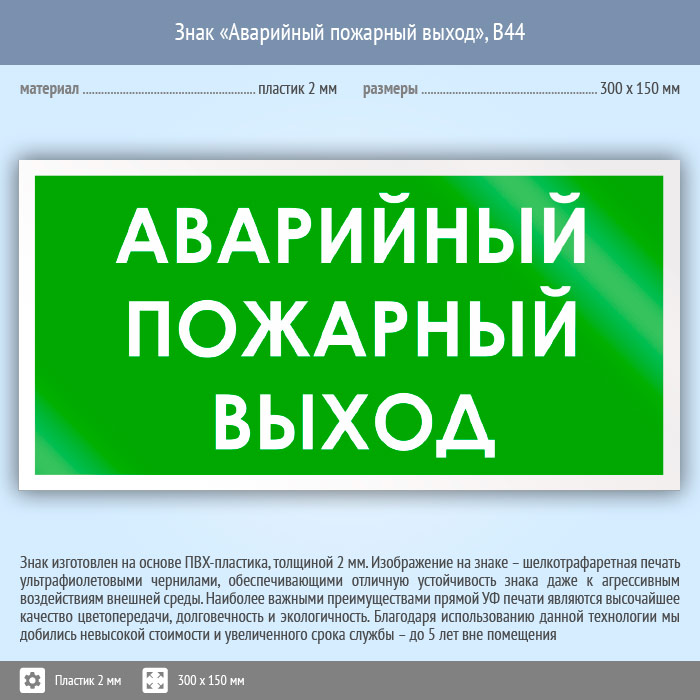Знак «Аварийный пожарный выход», B44 (пластик, 300х150 мм) в Ачинске купить