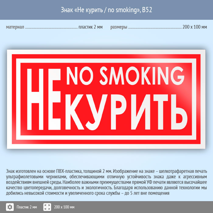 Знак «Не курить / no smoking», B52 (пластик, 200х100 мм) в Ачинске купить