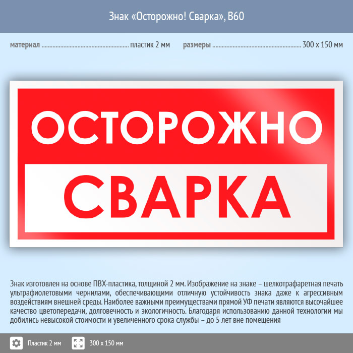 Знак «Осторожно! Сварка», B60 (пластик, 300х150 мм) в Ачинске купить