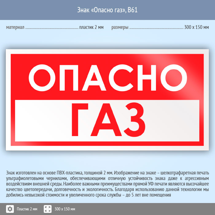 Знак «Опасно газ», B61 (пластик, 300х150 мм) в Ачинске купить