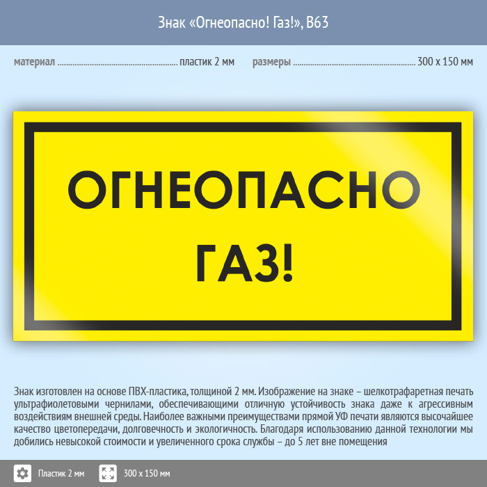 Знак «Огнеопасно! Газ!», B63 (пластик, 300х150 мм) в Ачинске купить