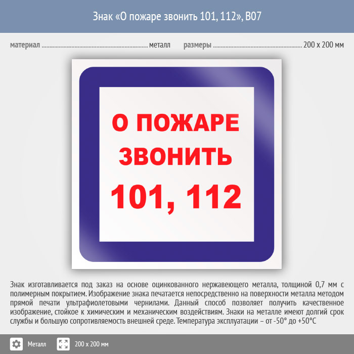 Знак «О пожаре звонить 101, 112», B07 (металл, 200х200 мм) в Ачинске купить