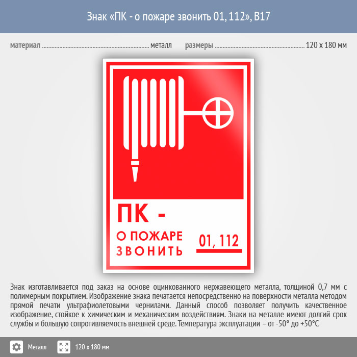 Знак «ПК - о пожаре звонить 01, 112», B17 (металл, 120х180 мм) в Ачинске купить