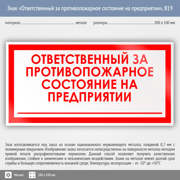 Знак «Ответственный за противопожарное состояние на предприятии», B19 (металл, 200х100 мм) в Ачинске купить
