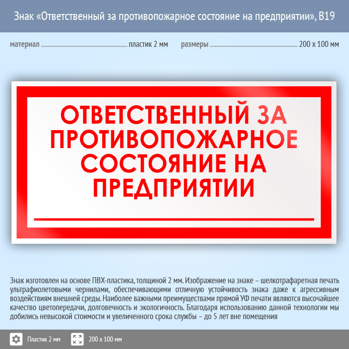 Знак «Ответственный за противопожарное состояние на предприятии», B19 (пластик, 200х100 мм) в Ачинске купить