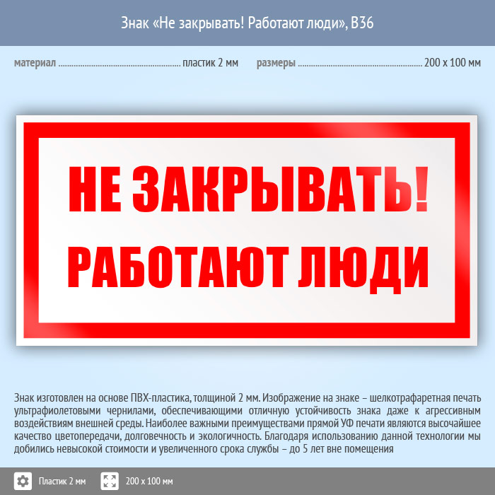 Знак «Не закрывать! Работают люди», B36 (пластик, 200х100 мм) в Ачинске купить