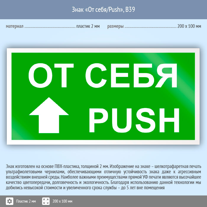 Знак «От себя/Push», B39 (пластик, 200х100 мм) в Ачинске купить