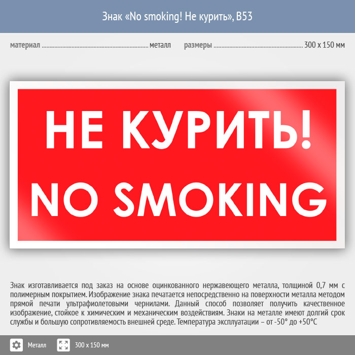 Знак «No smoking! Не курить», B53 (металл, 300х150 мм) в Ачинске купить