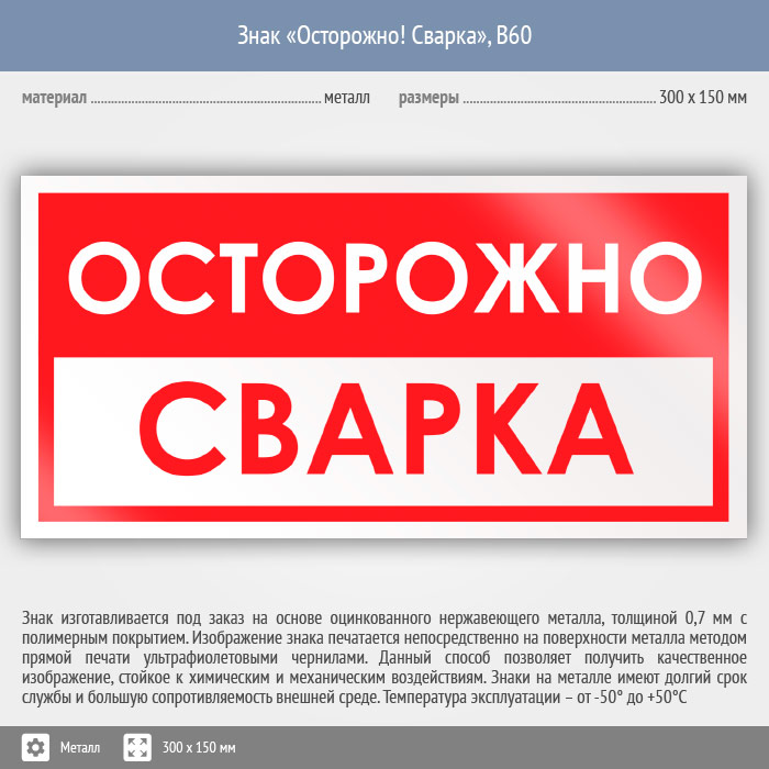 Знак «Осторожно! Сварка», B60 (металл, 300х150 мм) в Ачинске купить