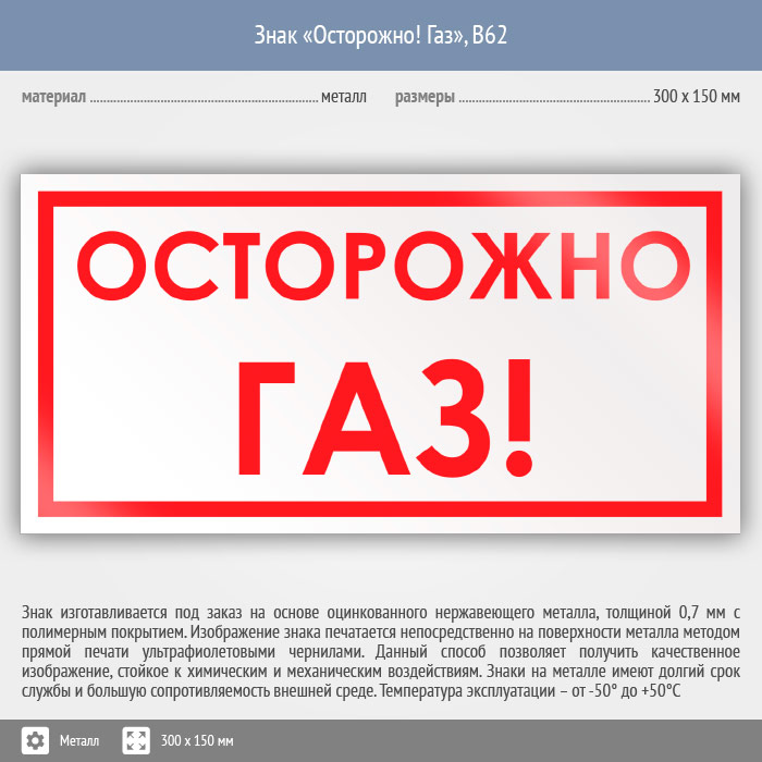 Знак «Осторожно! Газ», B62 (металл, 300х150 мм) в Ачинске купить