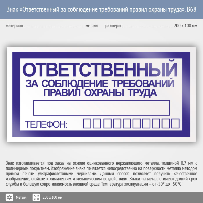 Знак «Ответственный за соблюдение требований правил охраны труда», B68 (металл, 200х100 мм) в Ачинске купить