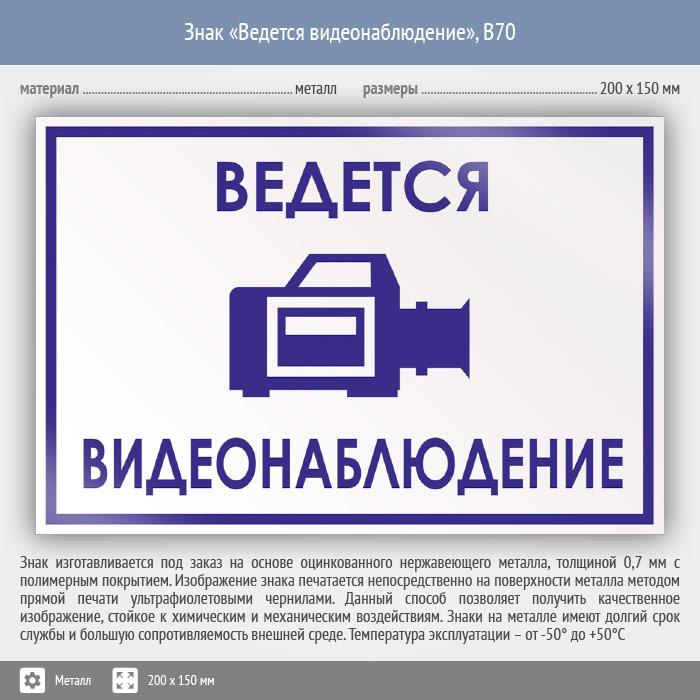 Знак «Ведется видеонаблюдение», B70 (металл, 200х150 мм) в Ачинске купить
