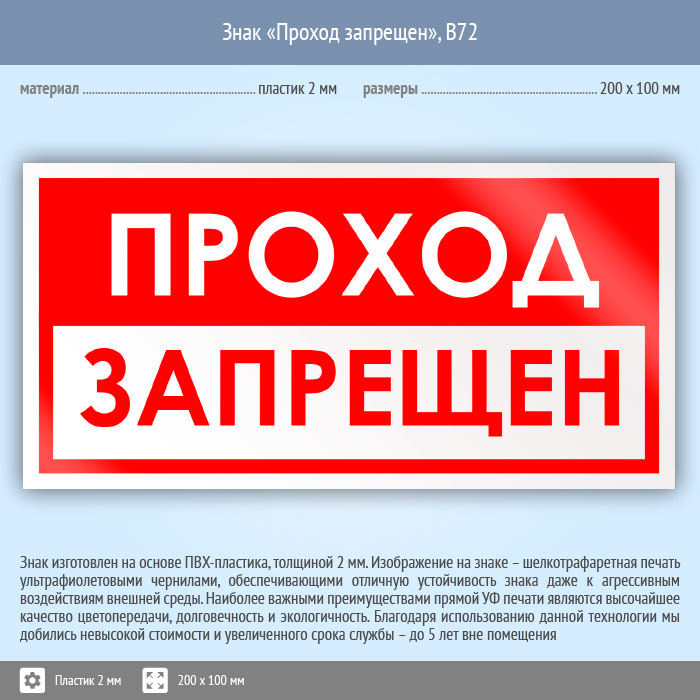 Знак «Проход запрещен», B72 (пластик, 200х100 мм) в Ачинске купить