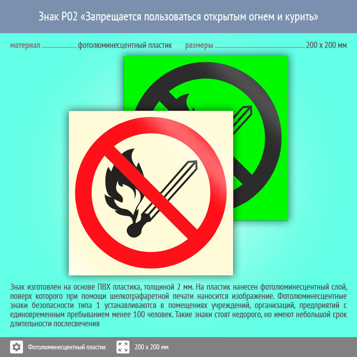 Знак P02 «Запрещается пользоваться открытым огнем и курить» (фотолюминесцентный пластик, 200х200 мм) в Ачинске купить