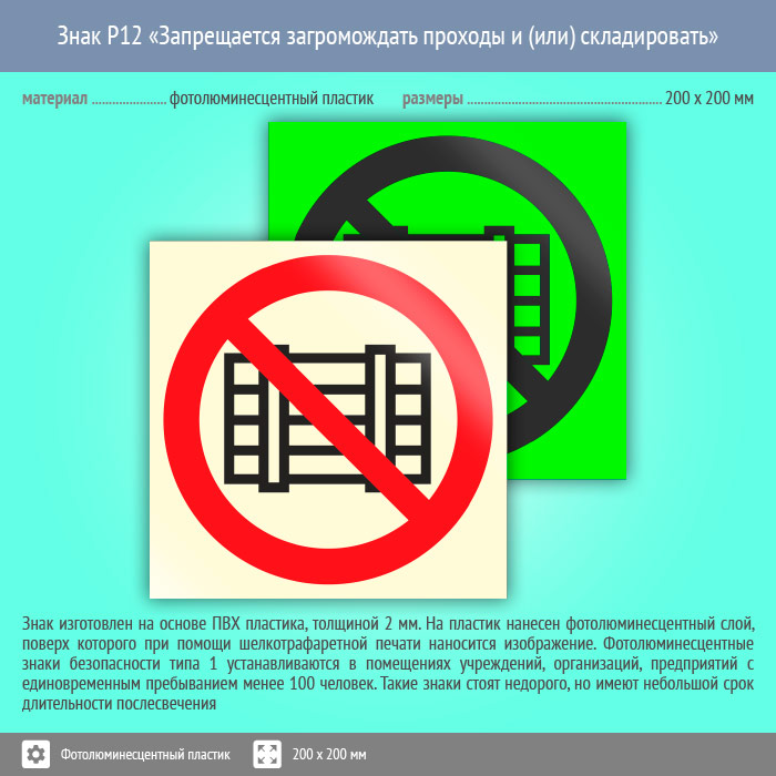 Знак P12 «Запрещается загромождать проходы и (или) складировать» (фотолюминесцентный пластик, 200х200 мм) в Ачинске купить