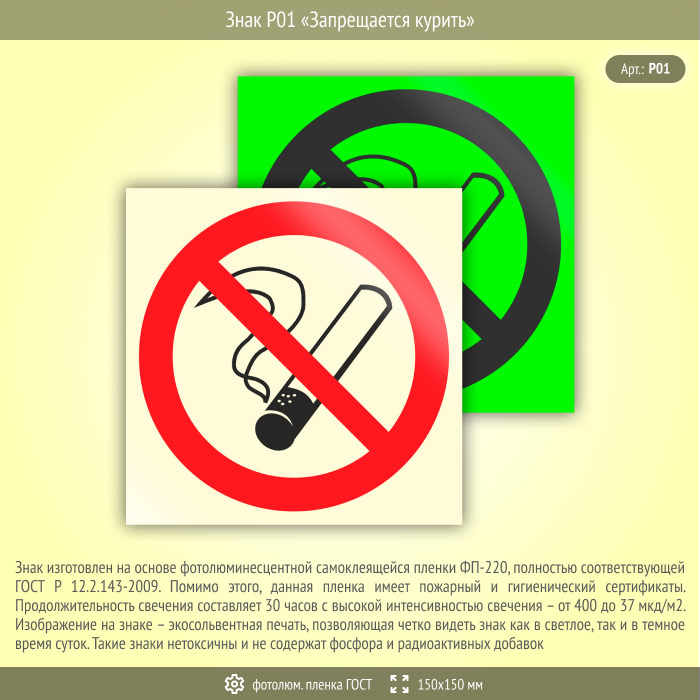 Знак P01 «Запрещается курить» (фотолюминесцентная пленка ГОСТ 34428-2018, 150х150 мм) в Ачинске купить