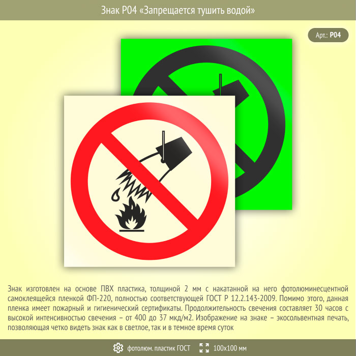 Знак P04 «Запрещается тушить водой» (фотолюминесцентный пластик ГОСТ 34428-2018, 100х100 мм) в Ачинске купить