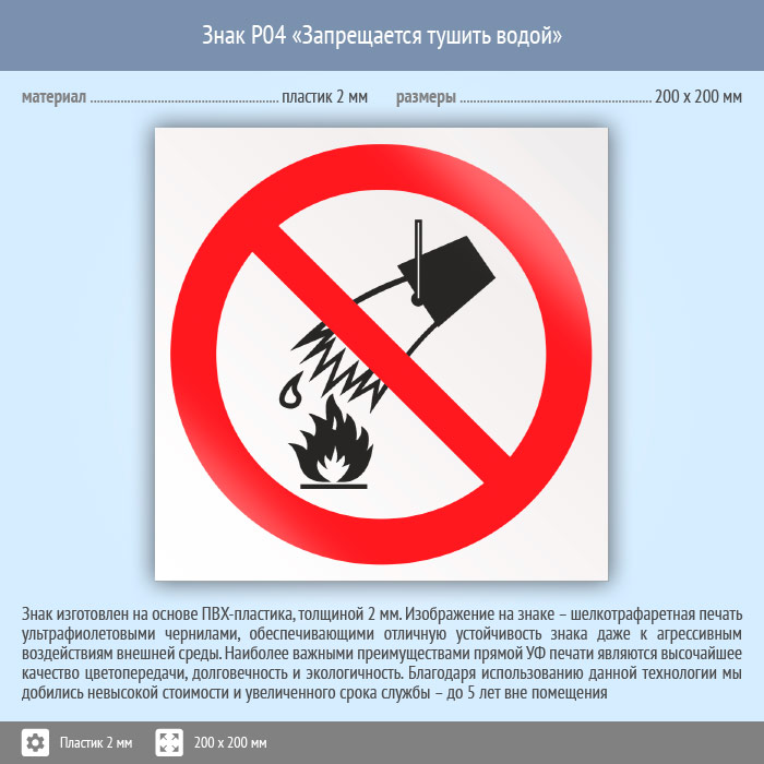Знак P04 «Запрещается тушить водой» (пластик, 200х200 мм) в Ачинске купить