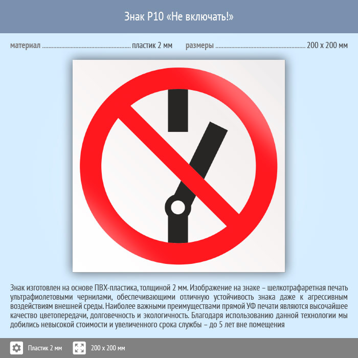 Знак P10 «Не включать!» (пластик, 200х200 мм) в Ачинске купить