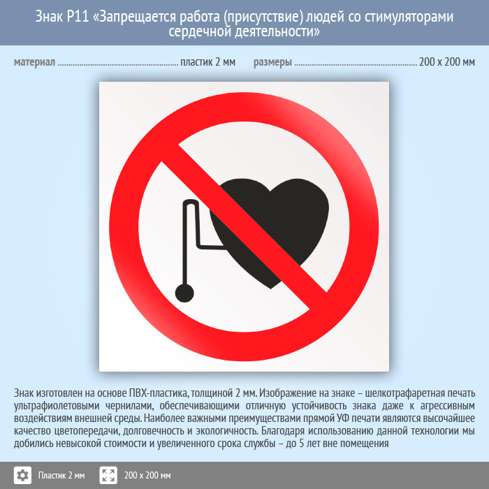 Знак P11 «Запрещается работа (присутствие) людей со стимуляторами сердечной деятельности» (пластик, 200х200 мм) в Ачинске купить