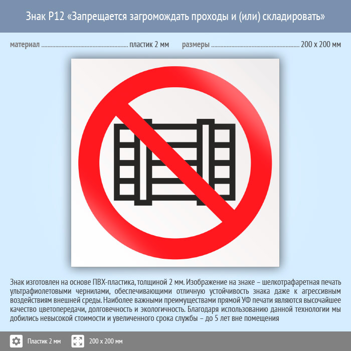 Знак P12 «Запрещается загромождать проходы и (или) складировать» (пластик, 200х200 мм) в Ачинске купить