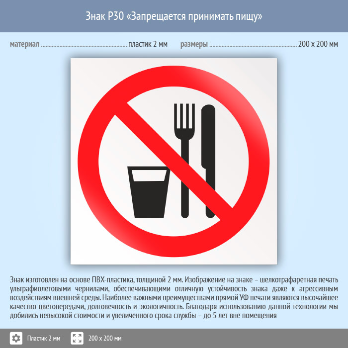 Знак P30 «Запрещается принимать пищу» (пластик, 200х200 мм) в Ачинске купить