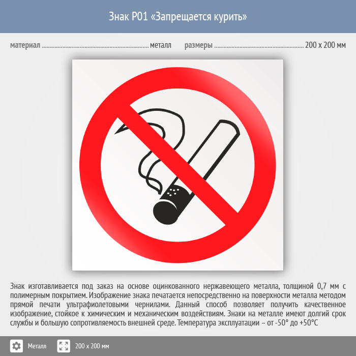 Знак P01 «Запрещается курить» (металл, 200х200 мм) в Ачинске купить