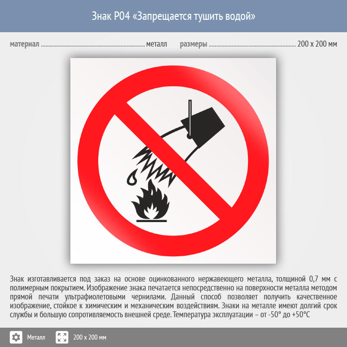 Знак P04 «Запрещается тушить водой» (металл, 200х200 мм) в Ачинске купить