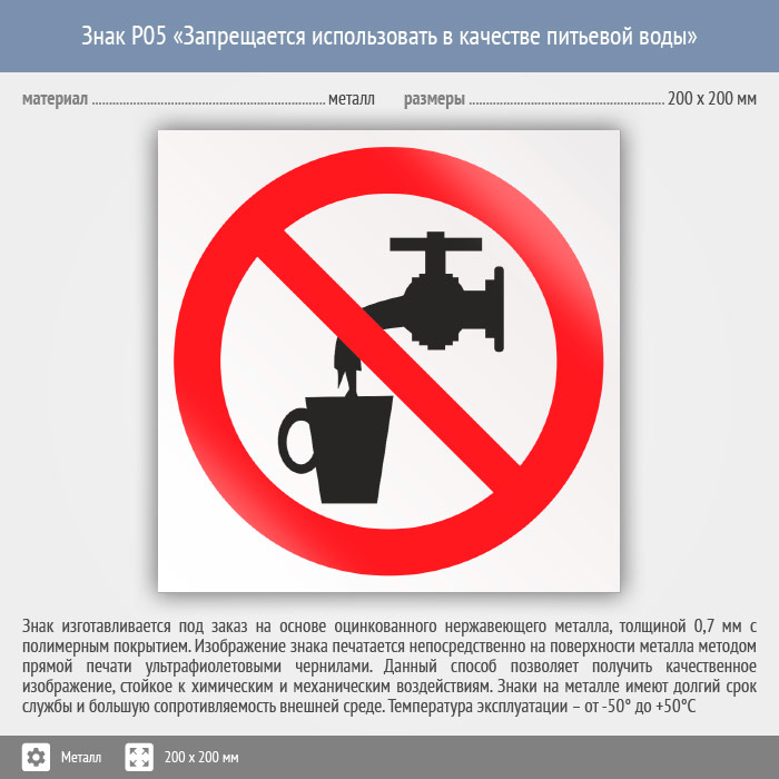 Знак P05 «Запрещается использовать в качестве питьевой воды» (металл, 200х200 мм) в Ачинске купить