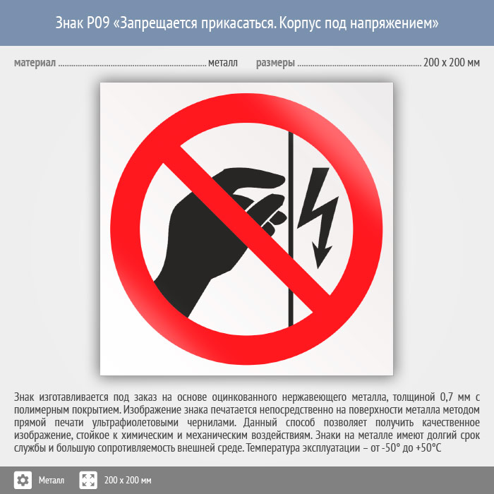 Знак P09 «Запрещается прикасаться. Корпус под напряжением» (металл, 200х200 мм) в Ачинске купить