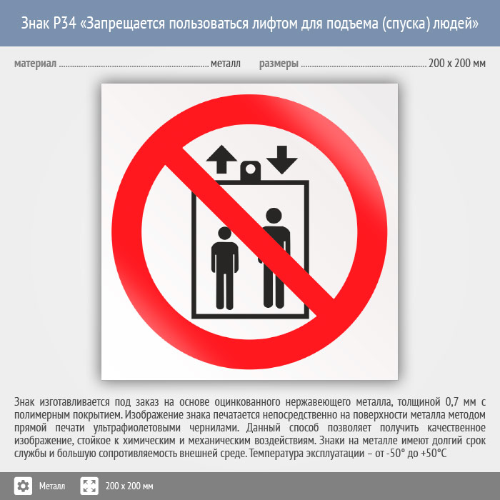 Знак P34 «Запрещается пользоваться лифтом для подъема (спуска) людей» (металл, 200х200 мм) в Ачинске купить