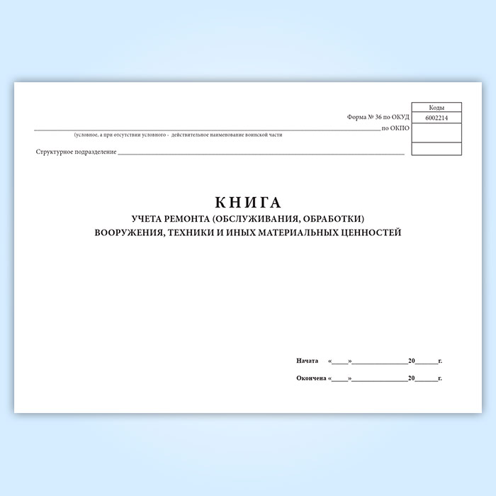 Книга учета ремонта (обслуживания, обработки) вооружения, техники и иных материальных ценностей (форма 36) в Ачинске купить