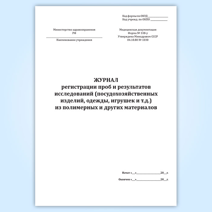 Журнал регистрации проб и результатов исследований (посудохозяйственных изделий, одежды, игрушек и т.д.) из полимерных и других материалов (форма № 338-у) в Ачинске купить