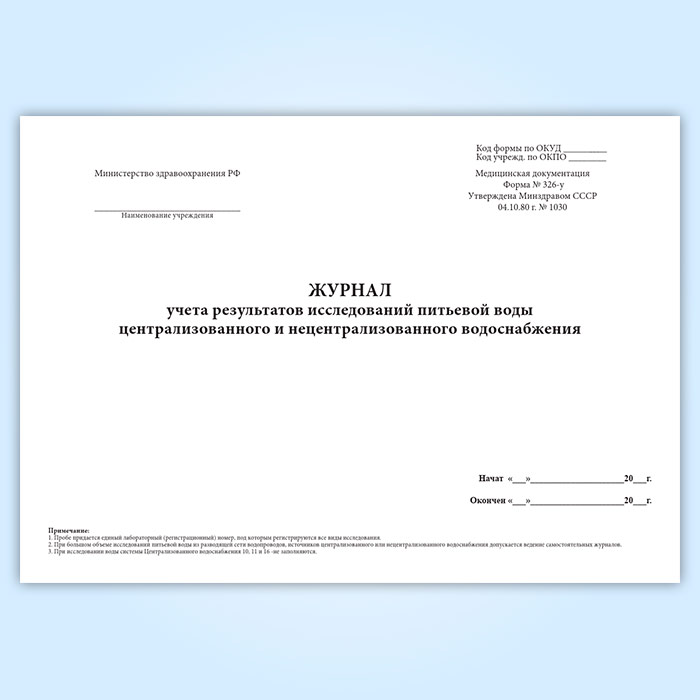 Журнал учета результатов исследований питьевой воды централизованного и нецентрализованного водоснабжения (форма 326-у) в Ачинске купить